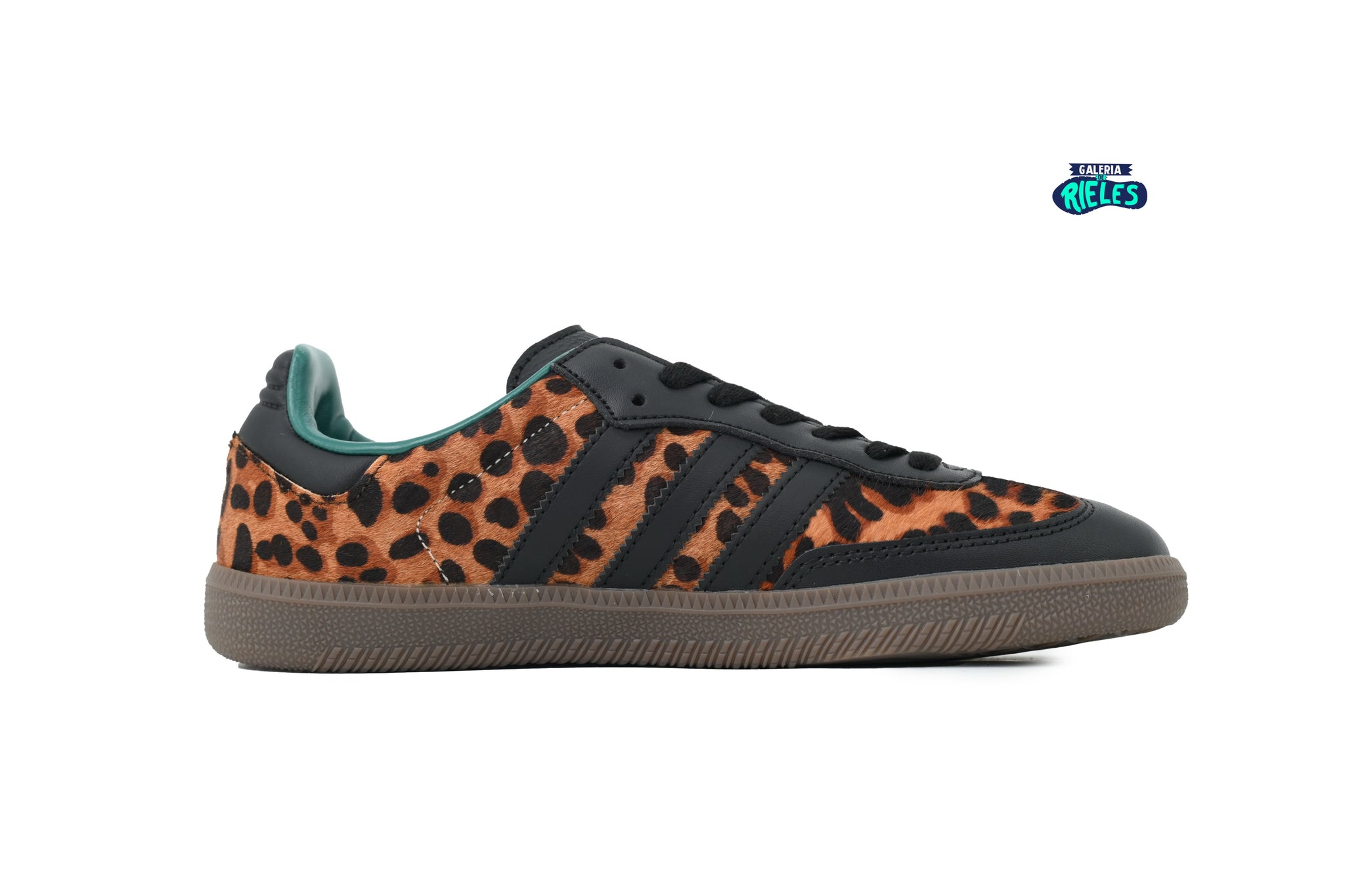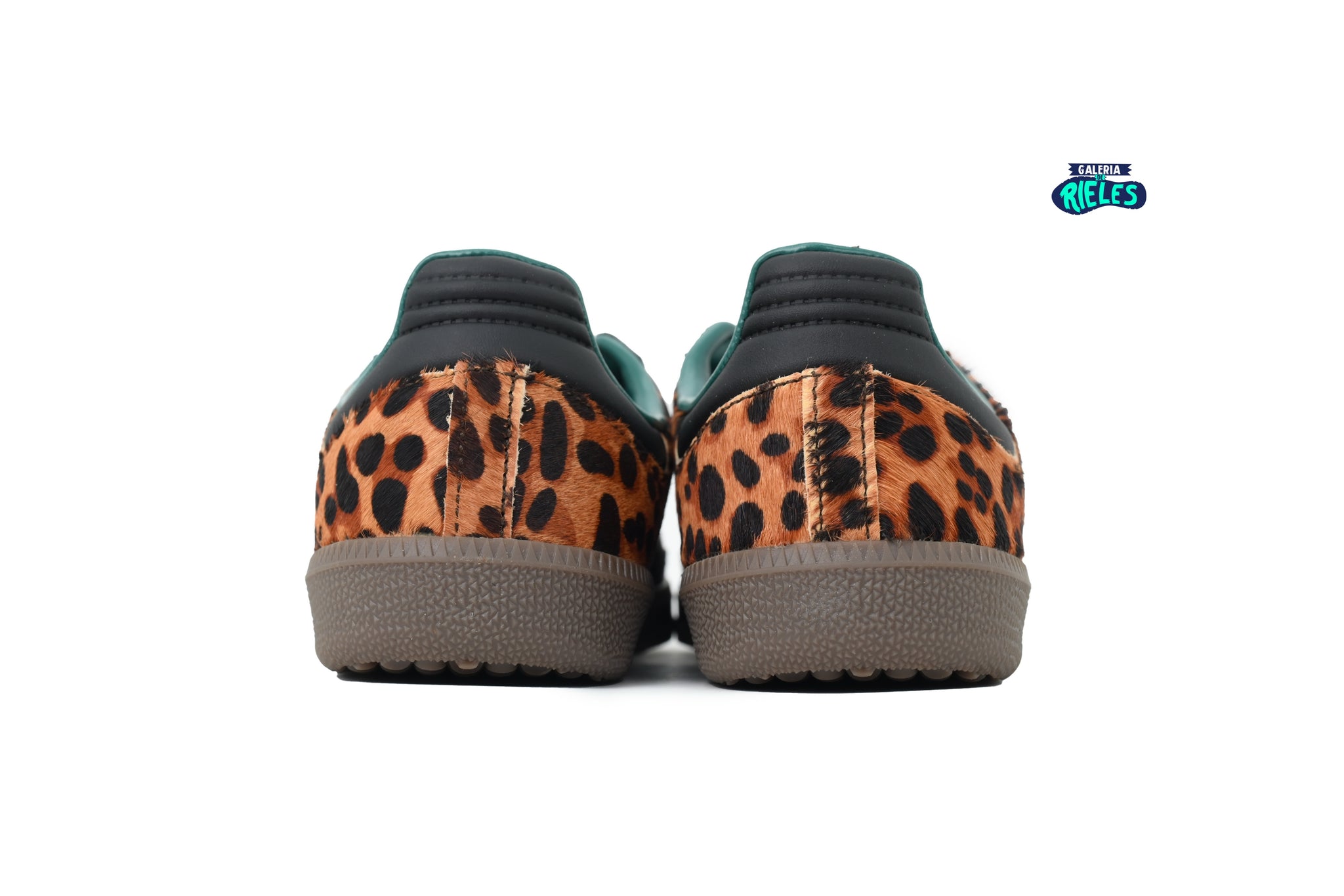 Los Adidas Samba Black Green Leopardo reinventan la silueta icónica de los Samba con un diseño llamativo que combina una base negra elegante, detalles en verde y un estampado leopardo que aporta carácter y estilo único.